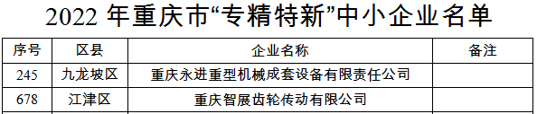 6月1日,重慶市經(jīng)濟和信息化委員會公布了2022年重慶市“專精特新“中小企業(yè)名單,經(jīng)主管部門審核推薦、第三方機構評審和公示等程序,重慶智展齒輪傳動有限公司、重慶永進重型機械成套設備有限責任公司均成功入選。